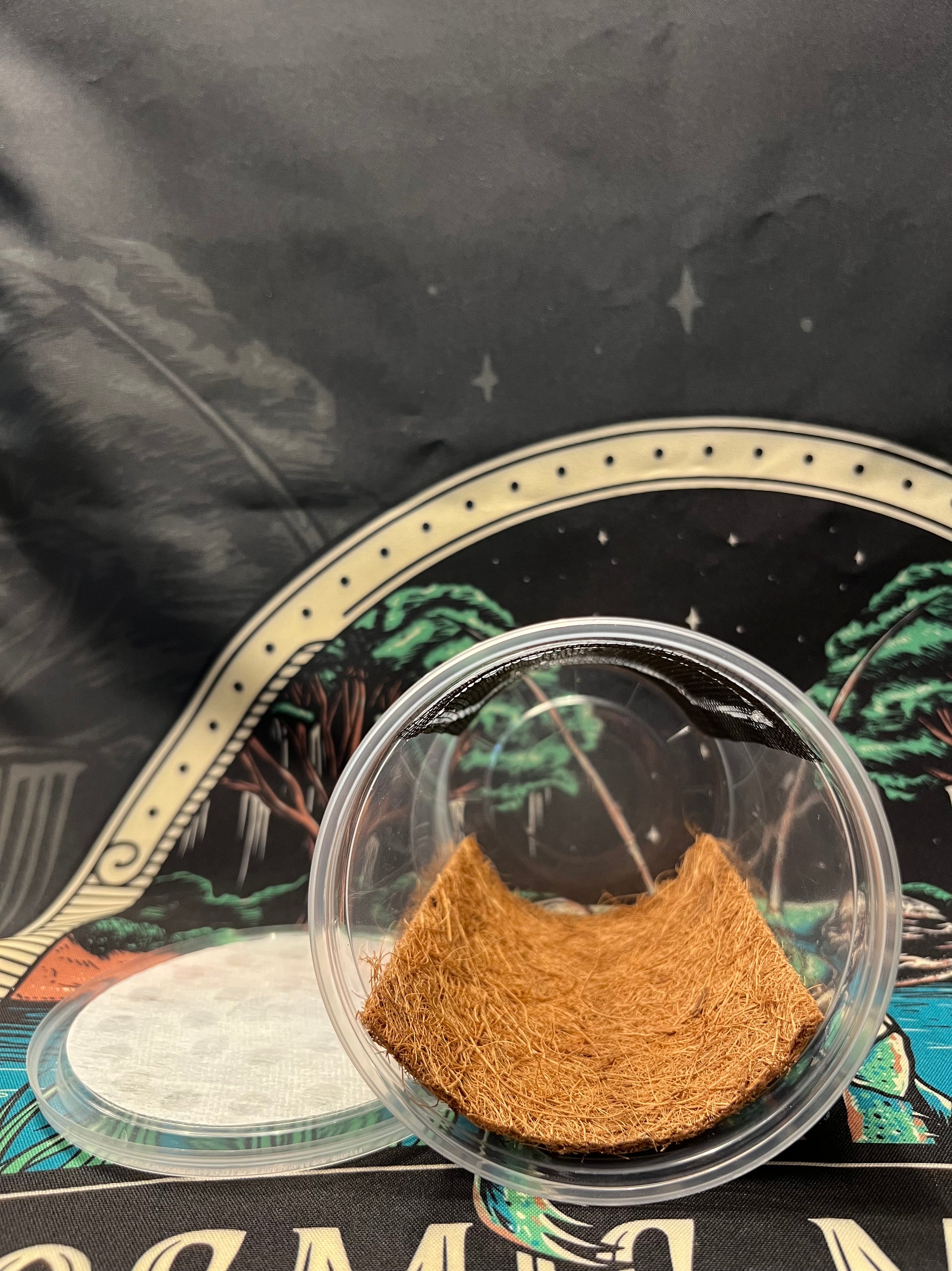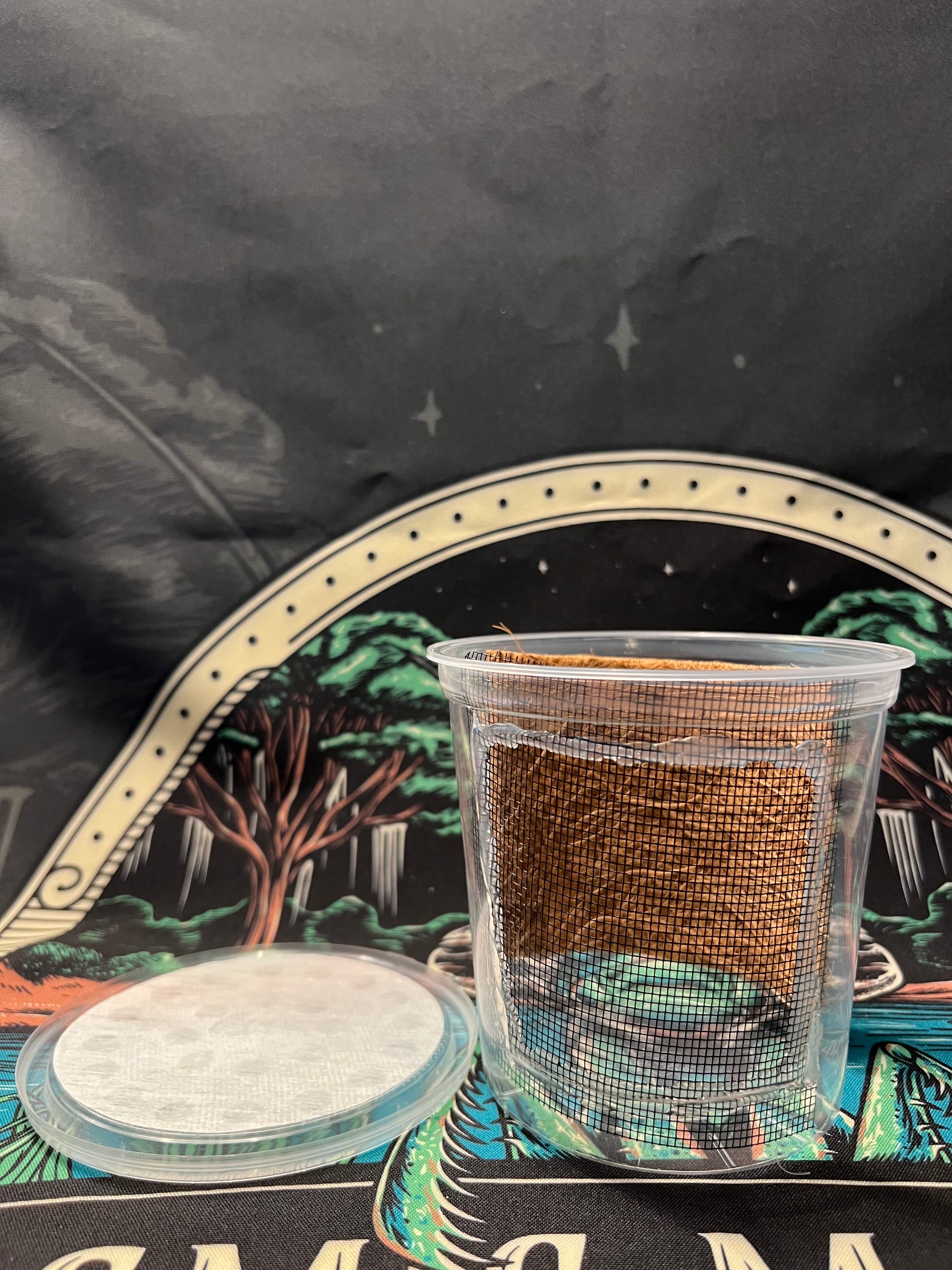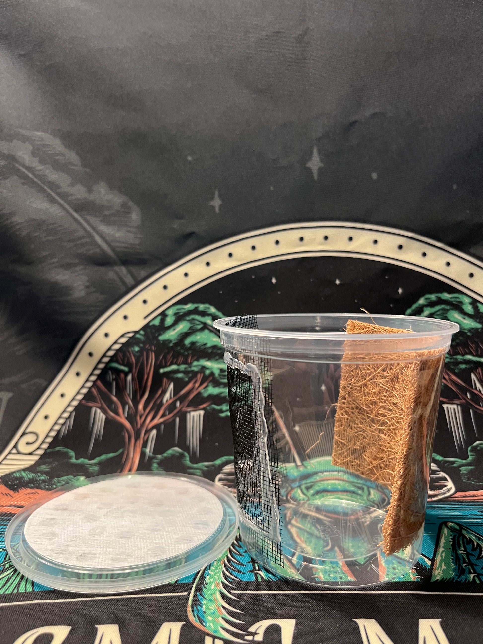 My Deli cups have been modified to suit your mantids needs. A layer of coco fiber mat is attached to the sides for extra grip, and a cut out front with added mesh for extra ventilation. Comes with a breathable mesh lid. Substrate options available.
